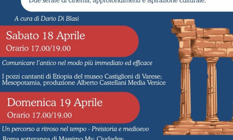 A Centuripe il cinema diventa strumento di conoscenza e racconto del passato. Sabato 18 e domenica 19 aprile, presso l’Ex Chiesa del Purgatorio (Via Battisti 30), si terrà “Cineforum ArcheoCiak”, una rassegna dedicata al cinema archeologico che accompagnerà il pubblico in un affascinante percorso dalla Preistoria al Medioevo.