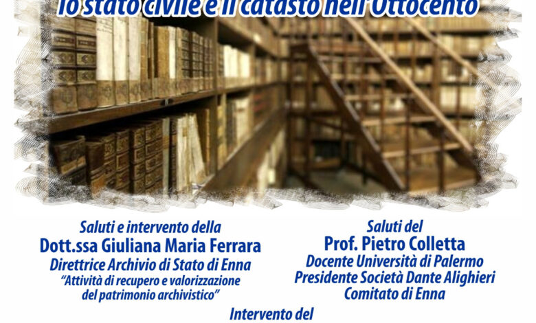 Il primo appuntamento è fissato per venerdì 21 novembre alle ore 17:30 presso l’Archivio di Stato di Enna (via Anzalone Tranchida, c.da S. Lucia), che in occasione dell’apertura straordinaria serale 2025 ospiterà l’incontro dal titolo “Nomi, terre, storie: lo stato civile e il catasto nell’Ottocento”.