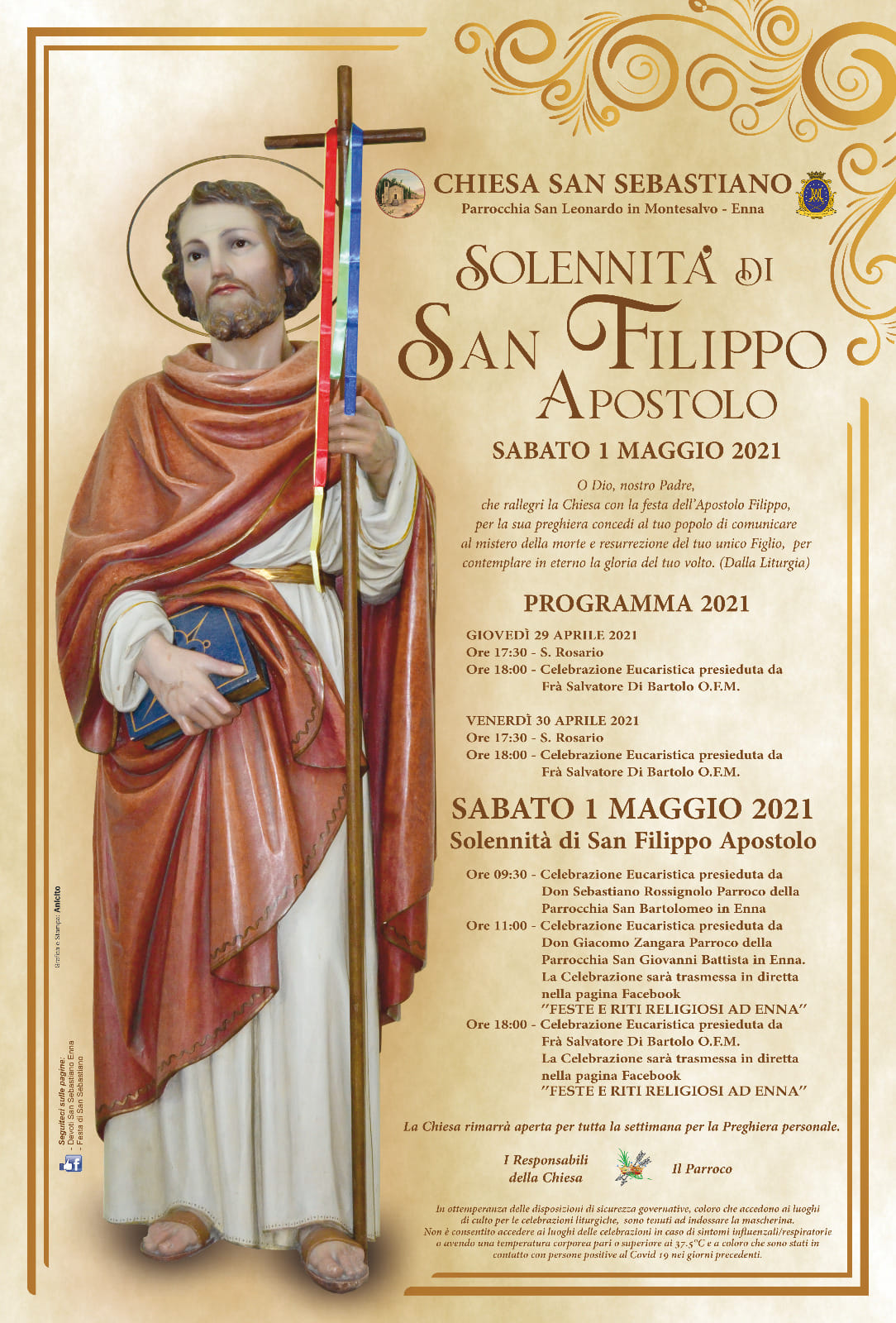 Si terrà giorno 1 maggio, come di consuetudine, la Festa di San Filippo Apostolo, presso la Chiesa di San Sebastiano. Le celebrazioni si susseguiranno dal 29 aprile a sabato 1 maggio, officiate da Fra Salvatore Di Bartolo o.f.m. della Parrocchia di San Leonardo in Montesalvo. La partecipazione è prevista nel rispetto delle norme anti-covid, ma saranno garantite anche le dirette sui canali social, come da programma.