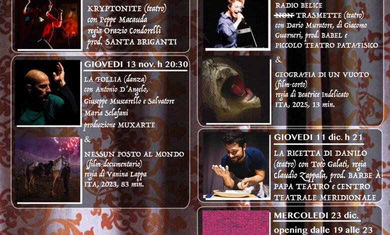 – giovedì 13 novembre danza e cinema con: LA FOLLIA di Giuseppe Muscarello, con Giuseppe Muscarello, Antonio D’Angelo e Salvatore Maria Sclafani (produzione Muxarte) e NESSUN POSTO AL MONDO regia di Vanina Lappa;