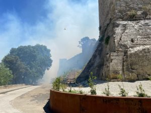 Un vasto incendio in queste interessa io capoluogo. A fuoco le pendici della Baronessa. Sul posto vigili del fuoco e 2 Canadair. Il fuoco è già arrivato al museo del Mito. Chiuso il Castello di Lombardia. Incerte le cause anche se non è difficile ipotizzare si possa trattare di incendio doloso.